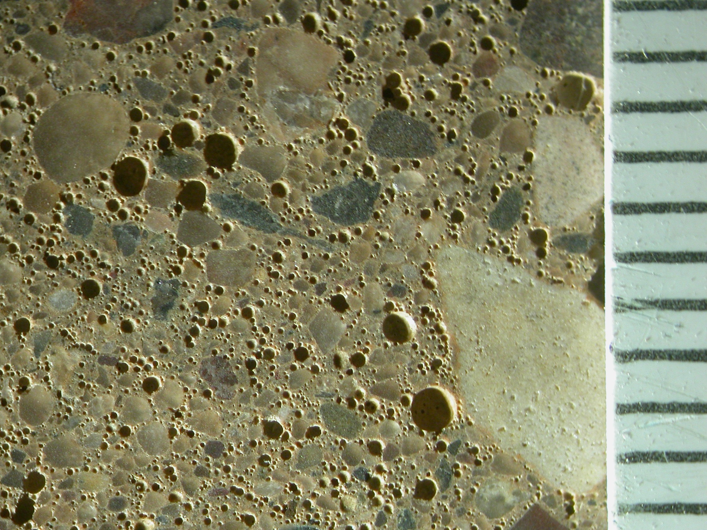 Proper air entrainment results in a well-dispersed system of air voids throughout the cement paste. When water in the concrete freezes, the air voids give it a place to expand. Then it doesn’t disrupt the cement matrix. The scale on the right is in mm. Photo: Mark Lukkarila.